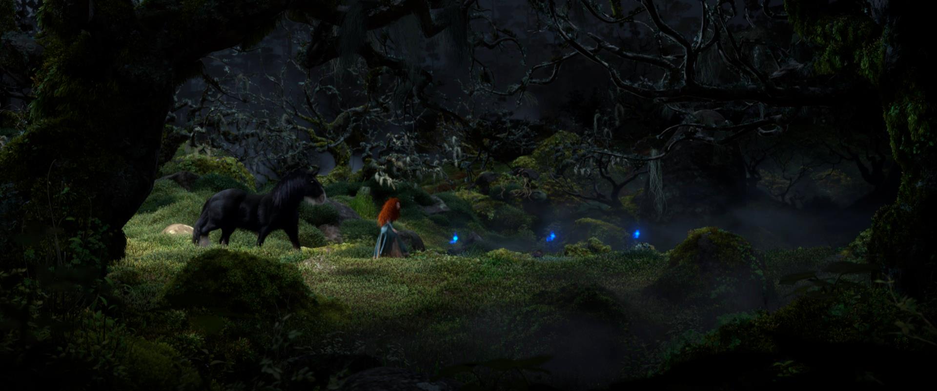 The environments within Brave are just as enjoyable to look at. In particular I love the forest environments throughout the film because they have so much detail. I really love how the trees and the leaves look very realistic and I like the texture that has been captured within the surface of tree bark and the rocks. I also really like the colours used with this environment and how the atmosphere of the environment changes throughout the film, which demonstrates the importance of colours and how they can be used to change the mood and tone of an environment. I also feel that the environments within Brave are also really good at leading the story and taking the audience through the story.